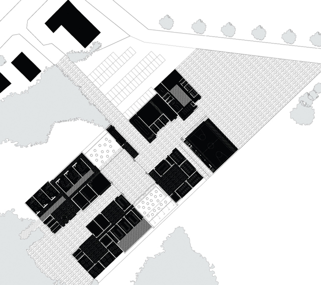 Zo zal zich niet ver van de wegverbinding met de woonwijk een wachtplaats voor de bus situeren, en worden de twee refters teruggetrokken om halverwege de speelstraat een plein te creëren. Dit plein betekent op zijn beurt de grens met het meest private deel met klassen (fig 6).