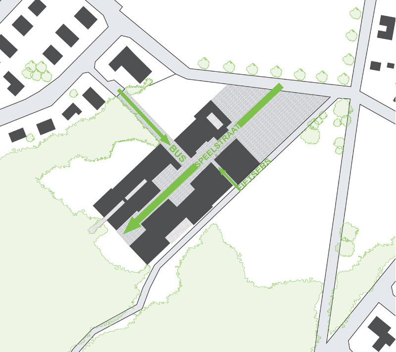 De speelstraat tussen kleuterschool en basisschool verbindt het nieuwe plein aan de voorzijde met het groene achtergebied. Parallel, tussen school en bos, wordt een aftakking voor fietsers voorzien. Vanuit de naastgelegen woonwijk wordt een straat verlengd tot aan het schoolgebouw. Het stratennetwerk wordt op deze manier doorgezet, en verbindt de school op verscheidene manieren met zijn omgeving (fig 4).